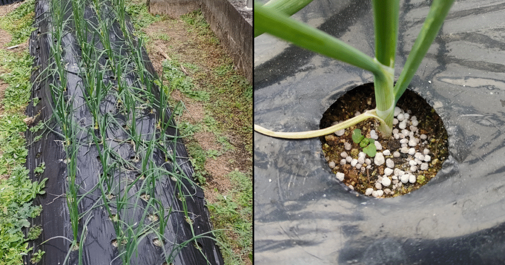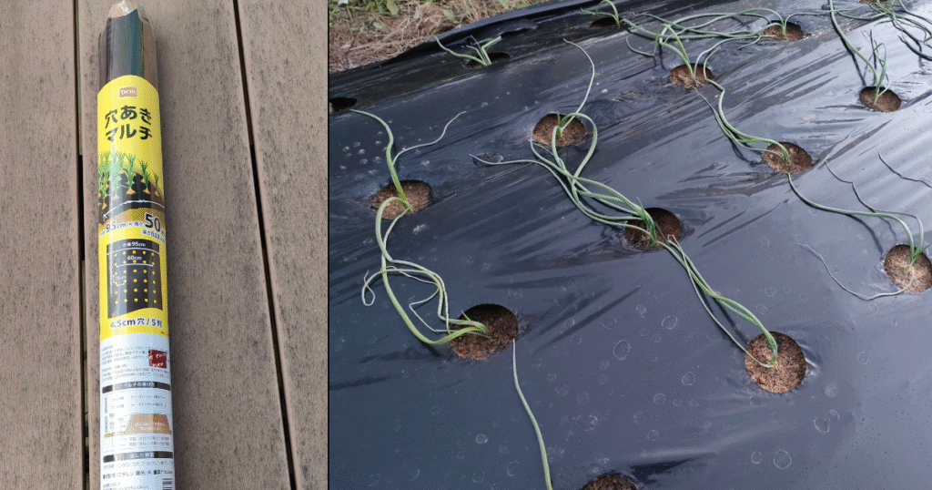 半日ほど根を水につけてから穴あき黒マルチに15cm間隔で合計110本植えました。