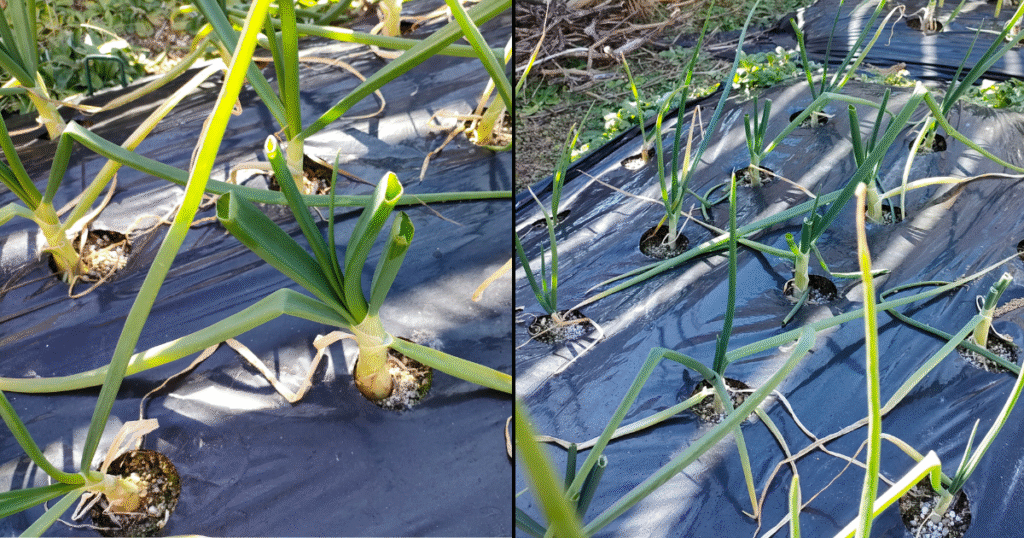 年明けでも愛知白玉ねぎ(写真右側)は他の品種より細い状態。挽回できるか?